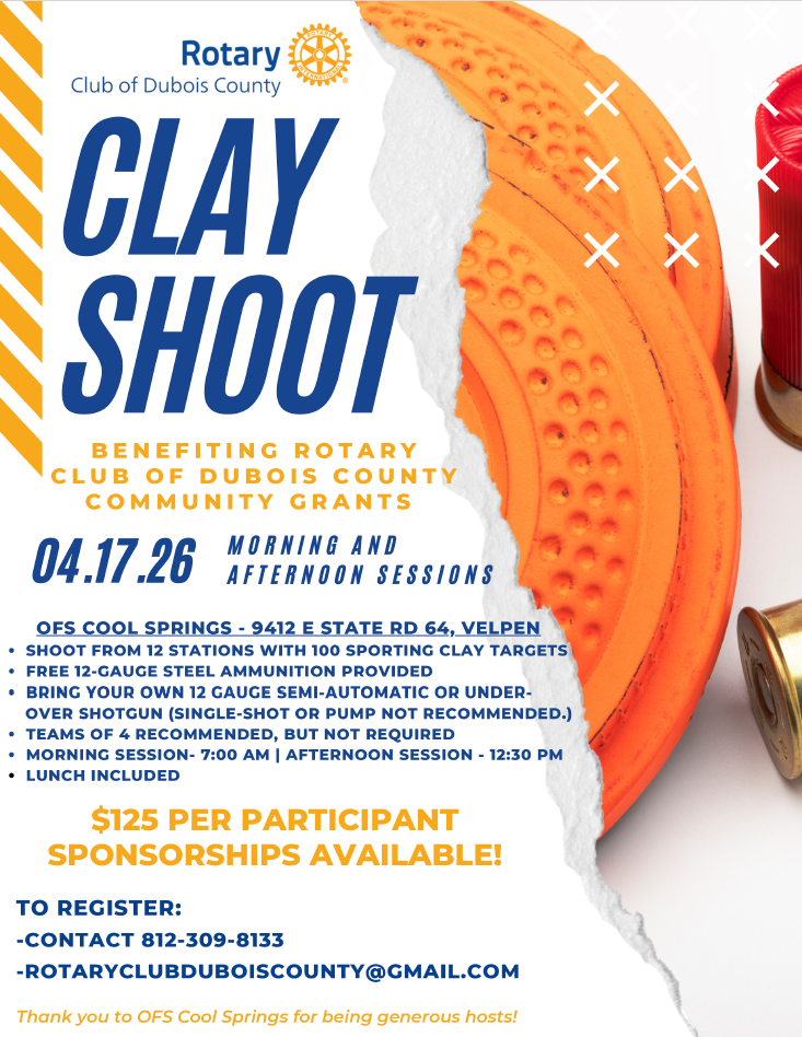The Rotary Club of Dubois County is inviting the community to take their best shot for a great cause at its 2026 Clay Shoot on Friday, April 17, at OFS Cool Springs.